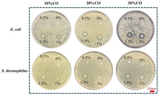 In this work, the beef extract peptone solid medium was prepared for culture observation. Four groups of PCUCF were sampled with 6 mm diameter discs using a hole punch and were sterilized for 4 hours under UV radiation. Then, the two bacteria were activated on a sterile clean workbench, and the activated bacteria were activated in a constant temperature and humidity box (LHS-150SC, Shanghai Yi Heng Technology Co., LTD., Shanghai, China) for 10 h. The activated E. coli and S. thermophilus were coated with beef peptone medium. Then, the prepared PCUCF was placed on the medium and sealed, and incubated in a constant temperature and humidity box at 37 °C for 12 h. The growth of bacteria and the formation of antibacterial zone around the experimental samples were observed and photographed.