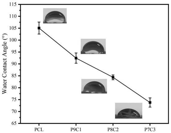 Samples were cut into 2 × 4 cm flake, fixed on the slide, and then a high precision syringe was used to place a drop of deionized water on the surface (5 μL). After standing for 5 min, the contact angle was tested with the camera and image analysis system of the Optical Contact Angle Measuring Instrument (OCA20, Dataphysics, Filderstadt, Germany). Each group of samples was measured 5 times and the average value was taken.
