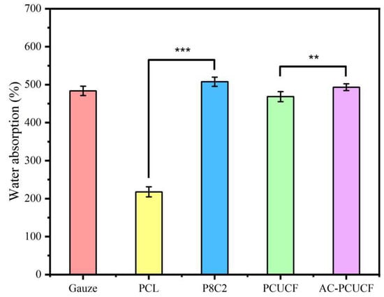 As shown in Figure 9, in the PCL/collagen fiber scaffold, with the increase of collagen content, the water contact angle of the fibers gradually decreased from 105 ± 2.3° to only 73 ± 1.5° for P7C3, and the fibers changed from super hydrophobic interface to strong hydrophilicity, indicating that the addition of collagen improved the hydrophilicity of the composite fibers. This is due to the existence of a large number of hydrophilic groups in collagen, which leads to the increase of its hydrophilicity. This is similar to Lee et al. It can be seen from Figure 10 that after the addition of collagen, the water absorption performance of P8C2 is significantly higher than that of PCL fiber and slightly higher than that of commercial gauze due to its good hydrophilicity. Figure 11 also shows that the water absorption performance of cross-linked AC-PCUCF is higher than that of PCUCF, because the cross-linked collagen makes the composite fiber have a more compact structure, which is more conducive to water absorption performance and retention. In general, the composite fiber has a strong water absorption performance (water absorption rate can reach 500%) whether or not the drug UA is added. It can be seen that the composite fiber can effectively absorb wound exudates as a medical dressing to avoid wound impregnation. To sum up, the addition of 20% collagen makes the composite fiber have better hydrophilicity and water absorption performance, and also has certain mechanical properties. Therefore, the following studies keep the collagen content at 20%.