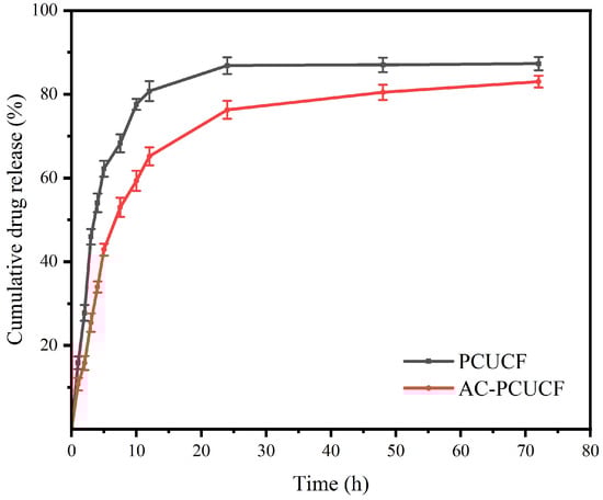 The standard absorption curve equation of UA obtained through absorbance test and calculation is y = 0.01425x + 0.04686 (R2 = 0.9997). The results of the in vitro sustained drug release experiment are shown in Figure 11. It can be seen from the image that in the first 8 h of PCUCF, the release rate of UA is faster, and the release rate reaches 61%. The drug release rate is 84 ± 2% after 24 h. The rapid drug release in the first 8 h indicated that the sustained release effect of UA in this matrix is fast. After crosslinking, the release time of AC-PCUCF was significantly delayed, the UA is not completely released after 72h, and the release trend is still rising. This is because the crosslinking of genipin makes the structure of collagen more compact, which can make the slow release of drugs become sustained and slow, which can also be intuitively seen from the SEM image. In conclusion, the chemical structure of PCUCF can be changed by crosslinking to control the release behavior of UA, which brings convenience to the research of drug-sustained release systems.