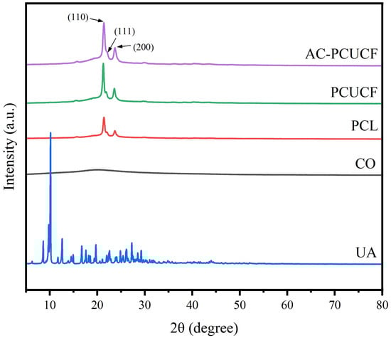 It is obvious in Figure 12 that PCL fibers have three typical characteristic diffraction peaks of 21.3° (110), 21.9° (111), and 23.6° (200) []. Compared with pure PCL fibers, the characteristic diffraction peak of PCL in the fiber sample added with collagen is significantly improved, which indicates that the addition of collagen can promote the crystallization of PCL. In the composite fibers PCUCF and AC-PCUCF, there are no characteristic diffraction peaks of UA, indicating that UA exists in composite fibers in an amorphous form.