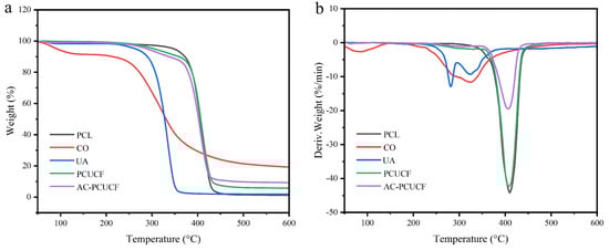 The TG curve of the fiber is shown in Figure 13a. At about 100 °C, the sample mass is slightly lost, because the residual water in the sample evaporates. At 220−370 °C, because of the thermal decomposition of UA, the sample has obvious mass loss. The great loss of sample quality at 370−440 °C is caused by the thermal degradation of collagen and PCL, which leaves ash after releasing gas. It can be seen from the DTG diagram that the maximum weight loss temperature of PCL fibers, PCUCF, and AC-PCUCF is about 410 °C. Compared with pure PCL and PCUCF, the addition of collagen hardly affects the thermal stability of the fibers. However, the weight loss rate of AC-PCUCF is much lower than that of PCUCF at the maximum weight loss temperature, and the final ash content is more. It can be seen that the cross-linked AC-PCUCF has better thermal stability than PCUCF. Wu and his colleagues have shown similar results in their research [].