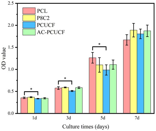 As shown in Figure 15, CCK-8 analysis shows that the number of HUVEC cells on PCL and composite fibers increased significantly with the extension of culture time. Only PCL blank control and PCUCF showed differences on the first, third, and fifth days. Compared with P8C2 and blank control group pure PCL, the OD value of composite fibers P8C2 added with 20% collagen is significantly higher than that of pure PCL on the secenth day with the extension of time, indicating that the addition of collagen is more conducive to cell adhesion and proliferation. Moreover, the proliferation results of PCUCF and AC-PCUCF added with UA are similar to P8C2, which also show good cell compatibility. These results indicate that HUVEC cells have good adhesion and proliferation ability on composite fibers P8C2, PCUCF, and AC-PCUCF. More importantly, the composite fibers has good biocompatibility for cell growth and proliferation in vitro.