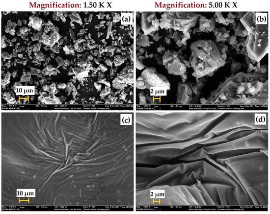 To examine the variations in the surface morphology of the particles, a SEM investigation was conducted before and after surface modification using Pluronic® P-123. The SEM images of the calcite and mCalcite at different magnifications are presented in Figure 2. It can be seen clearly from the SEM images that the surfaces of the calcite particles were coated with the triblock PEG–PPG–PEG copolymer (Figure 2c,d) after surface modification.