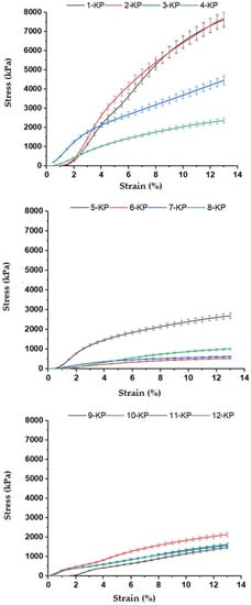 The mechanical strength of the polyDCPD composites was determined using compression tests performed at room temperature. The stress–strain curves that were recorded using the data obtained from the original software of the test device are presented in Figure 5, whereas the compressive moduli (R5) of the samples are tabulated in Table 3. It can be seen from Figure 5 that all the composite samples exhibit similar deformation behavior under compressive force. As with all the other measured properties, it was observed that the mechanical properties of the polyDCPD composites changed depending on the experimental parameters. On the other hand, the compressive modulus values of the control samples (9-KP, 10-KP, 11-KP, and 12-KP) were found to be close to each other, as expected (in the range of 31.3–37.9 MPa), and the highest value was recorded for 2-KP (130 MPa) (see Table 3). Sample 2-KP has the advantage of low nominal porosity (75 vol% of internal phase), leading to a low ratio of voids in the polymer matrix.