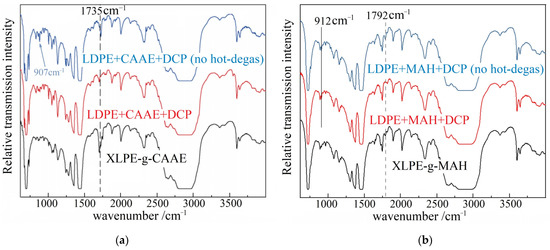 FTIR spectra of the raw material blends (without crosslink and graft) before and after vacuum hot-degas (blue and red curves) and the grafted XLPE (black curves) by (a) 1.0 wt% CAAE and (b) 1.0 wt% MAH.