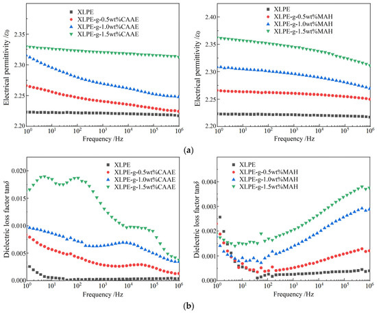 Although the three published papers have reported DC dielectric performances of CAAE and MAH graft-modified XLPE, no reports have been so far presented for dielectric frequency spectra and AC insulation strength of XLPE modified by CAAE and MAH grafting [29,30,36]. Therefore, the complex dielectric function and AC dielectric breakdown strength of the CAAE- and MAH-grafted XLPE materials are tested and analyzed. Compared with XLPE benchmark, both the relative dielectric permittivity and dielectric loss factor of XLPE-g-CAAE and XLPE-g-MAH are notably higher and increase with the increasing graft content, as shown in Figure 3, which is attributed to the fact that the multiple polar groups in the grafted CAAE and MAH are actual dipoles for undergoing orientation polarization under AC electric fields. As the electric field frequency increases, it is more difficult for these dipoles to be completely polarized in one orientation by keeping up with the alternation of external electric field, resulting in the dielectric permittivity abatement and dielectric loss exacerbation. In the relatively lower frequency region, the dielectric loss is dominantly derived from the resistance to transient electric conduction of oscillation carriers (merely a part kind of charge carriers for electric conductance under DC electric field), which are not derived from the electric dielectric orientations of polar-group dipoles on the grafted CAAE and MAH, as indicated by the declining loss factor with increasing frequency; in the relatively higher frequency region, the dipole orientation polarization gradually fails to keep up with the applied AC electric field so that relaxation polarization loss increases significantly and exceeds conductance loss, as manifested by the higher dielectric loss factor of the graft-modified XLPE than that of the XLPE benchmark, which is intensified with increasing graft content.