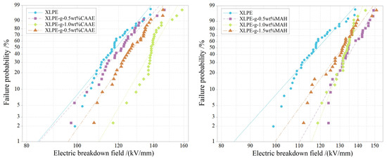 Electric breakdown fields in 2-parameter Weibull statistics for XLPE-g-CAAE (left panel) and XLPE-g-MAH (right panel) in comparison to XLPE.