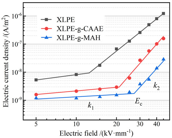 Characteristic profiles of electric current density versus electric field density (J–E curves) of XLPE and its graft-modified materials in double-logarithmic coordinates represent a two-stage linearity, as shown in Figure 5. The linearly fitted slopes, k1 and k2, are called nonlinear coefficients, and the position of crossing point by k1 and k2 lines is called critical electric field, Ec, as shown by the fitted values in Table 2, which distinguishes the transition from Schottky-injected conduction to space charge-limited conduction. The electric current density of XLPE has been remarkably abated to 15 times lower after grafting CAAE or MAH. Meanwhile, the critical electric field of the grafted XLPE is evidently higher than that of XLPE benchmark and even doubled for XLPE-g-MAH. In contrast, the electric conductivity of the MAH-grafted XLPE material prepared by ultraviolet-initiated grafting technology is slightly lower than that of the peroxide thermochemically grafted XLPE material in this study [30]. The peroxide thermochemical grafting method will cause a small amount of halfway reactions and residual-grafting initiators existing in the grafted XLPE, which will provide additional charge carriers under electron thermal excitation, resulting in a slightly higher electric conductivity compared to ultraviolet initiation grafting technology, but still meeting the requirement of cable manufacturing for XLPE insulation.
