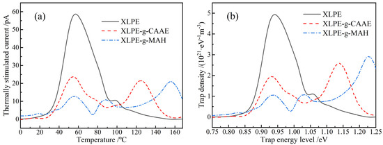The trap level distributions are derived from TSDC spectra, according to the thermal excitation current theory [39], as shown in Figure 6b. The trap density peaks at 0.95 eV and 1.04 eV correspond to the thermally excited releases of the trapped charges in XLPE intrinsic traps and antioxidant chemical traps, respectively. Since the grafted polar-group molecules introduce a large number of deeper-level traps, and charge carriers prefer to fall into deeper traps rather than shallower ones, the XLPE intrinsic TSDC peak intensity is significantly reduced. Compared with the introduced deep trap of 1.12 eV in XLPE-g-CAAE, the graft of MAH is preferable for acquiring deeper traps of 1.23 eV. In comparison, the XLPE-g-MAH prepared by ultraviolet initiation grafting technology can acquire deep charge traps at a depth level of 1.25 eV, which is very close to the 1.23 eV fulfilled by thermochemical method in the present study [30]. Therefore, the CAAE- and MAH-grafted XLPE materials prepared by thermochemical method can effectively introduce deeper traps than the intrinsic charge traps derived from polymer structural defects to inhibit charge injections from electrodes and impede charge carrier transports even at 150 °C.