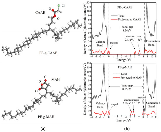 According to all-electron atomic-orbit first-principles schemes, the polyethylene (PE) grafted with CAAE and MAH molecules are modeled and calculated for electronic properties. Projected density of states (PDOS) is exploited to elucidate the electronic bound states introduced by the grafted polar-group molecules in PE band-gap, which accounts for energy levels and densities of hole traps (the occupied bound states) and electron traps (the unoccupied bound states). The molecular models of the PE grafted with CAAE and MAH (PE-g-CAAE and PE-g-MAH) and their PDOS are shown in Figure 7, and the derived charge trap levels are listed in Table 3. It should be noted that the two molecular models present an identical band-gap of ~8 eV, which agrees well with the experimental result of XLPE material, but they incorporate no electronic bound states derived from intrinsic structural defects of XLPE material as represented in the molecular-level models of multiple-molecule-assembled condensed matters. Both the grafted CAAE and MAH introduce electronic bound states near PE electron band-edges, which are almost degenerated with band-edge levels to be merged into conduction or valence band and hereby become the new band-edges, resulting in a slightly narrower band-gap. Two unoccupied electronic bound states arising below conduction band minimum (CBM) in both PE-g-CAAE and PE-g-MAH models demonstrate, in theory, that deeper electron traps can be introduced by grafting CAAE or MAH into XLPE material.