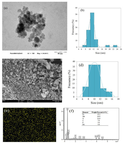 Figure 1d shows the FTIR spectrum of chitosan, MnFe2O4, and Pd-Chit@MnFe2O4. In the FTIR spectrum of chitosan, the absorption band showed at 3348 cm−1 (–O–H) [69], 2874 cm−1 and 2919 cm−1 (–CH2 and –CH3) [70], 1638 cm−1, 1560 cm−1, and 1318 cm−1 (–C=O, stretching of amide I, –N–H bending of amide II, and –C–N stretching of amide III) [71], 1375 cm−1 (–C–H) [72], 893 cm−1 and 1150 cm−1 (C–O–C stretching of glycosidic linkages) [73], 1060 cm−1 and 1023 cm−1 (–C–O stretching vibration of a secondary alcohol and primary alcohol), respectively [74]. A similar trend was observed on Pd-Chit@MnFe2O4, yet Pd-Chit@MnFe2O4 showed shifting of the stretching vibrations of chitosan’s (–C–O–C) from 1023 to 1031 cm−1. The shifting indicates that the bond strengths of C–O–C in glycosidic bonds increased due to environmental differences after the ionic gelation process [75]. Noted, it also implied that manganese ferrite was successfully coated with chitosan via cross-linked TPP. The case of MnFe2O3 showed the elimination of absorption peaks belonging to –CH2, –CH3, and C–O–C. The morphology and particle size distributions of Chit@MnFe2O4 and of Pd-Chit@MnFe2O4 were characterized by SEM and TEM analyses, respectively. From Figure 2a,c, it can be observed that the MnFe2O4 particles were mostly spherical-shaped with various sizes. The surface morphology of the catalyst was spherically shaped as well (Figure 2e). The average diameter of Pd-Chit@MnFe2O4 determined from the TEM image was about 11 ± 5 nm (Figure 2b) whereas the average diameter of Pd-Chit@MnFe2O4 determined from the SEM image was 10 ± 2 nm (Figure 2f). Figure 2c is the TEM micrograph of Chit@MnFe2O4 showing the average particle size from the corresponding diameter distribution, which is in the range of 6 nm (Figure 2d). Thus, the reported higher size in Pd-Chit@MnFe2O4 is due to the capping of Pd nanoparticles. The catalytic activity of the Pd catalyst is probably due to the following effects: A high absorption capacity was provided by the morphology of Pd nanocomposite which in turn, decreased the induction time. Additionally, the catalytic activity was improved due to the strong synergistic effects of its constituents. (−NO2) group can be reduced to an amine and aniline by the Pd-Chit@MnFe2O4 nanocomposite. Without Pd as catalytic hydrogenation, the catalytic reduction reaction cannot proceed. As the catalyst was added into the system, ions were adsorbed by Pd, due to strong adsorption capacity and reduction reaction removed oxygen and added hydrogen. Then the active species reduced −NO2 into −NH2, which indicated the catalyst’s critical role in this reduction. In Figure 2h, EDS analysis indicates that Pd-Chit@MnFe2O4 was mainly composed of C, O, Fe, and Mn, P, and Pd. The P originated from the CS cross-linked with the TPP ion by ionic gelation [58]. The EDS and mapping micrograph proved that the immobilized Pd NPs were well-dispersed on the Chit@MnFe2O4 support (Figure 2g).