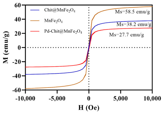 Magnetization curves of MnFe2O4, Chit@MnFe2O4, and Pd-Chit@MnFe2O4.