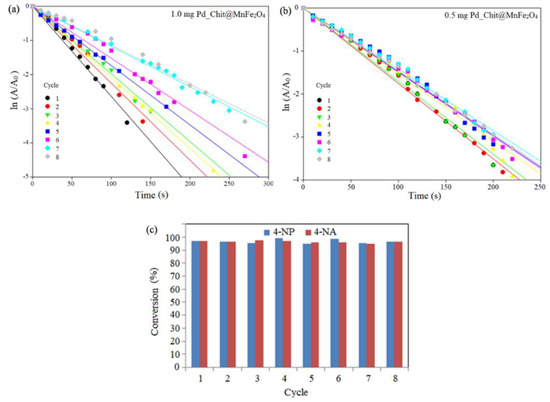 The pseudo-first-order kinetic plot of 8 consecutive cycles of 4-NP and 4-NA reduction reactions is displayed in Figure 5a and Figure 5b, respectively. Results show that the conversion of 4-NP and 4-NA was ~100% for 8 consecutive cycles (as shown in Figure 5c), which indicated that Pd-Chit@MnFe2O4 was stable and can be reused up to 8 consecutive cycles. The minimum loss of catalyst nanoparticles during the recycling process may lead to a slight increase in reaction time upon cycles for both 4-NP and 4-NA reduction.