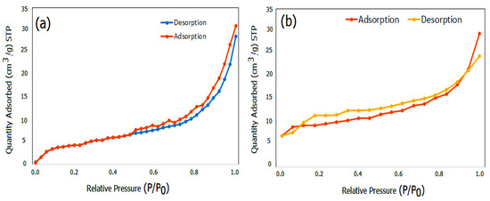 The surface area of the pure Pd and Pd-Chit@MnFe2O4 samples was estimated by Brunauer–Emmett–Teller surface area analysis (BET) (Figure 9a and Figure 9b, respectively). According to the results, the surface area of 25.614 and 2.292 m2·g−1 were found for palladium nanoparticles. The higher BET specific surface area of the Pd-Chit@MnFe2O4 nanocomposite compared with pure Pd can be ascribed to the introduction of Chit@MnFe2O4 particles in the composite and is beneficial to improve the catalytic performance.