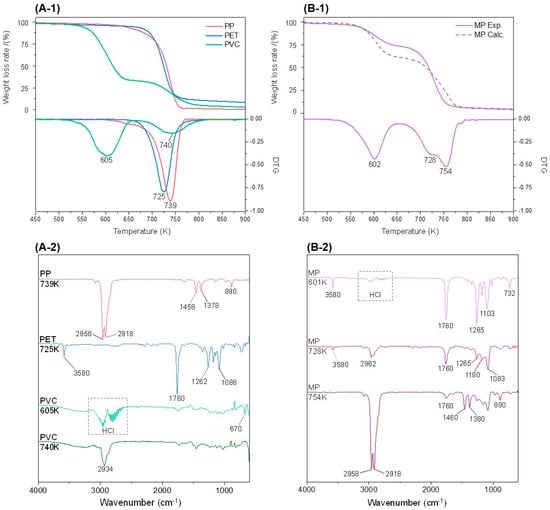 (A-1) TG, DTG curves for pyrolysis of PP, PET, PVC; (A-2) independent FTIR spectra of PP, PET, and PVC; (B-1) TG, DTG curves of MP; (B-2) FTIR spectra for each temperature peak of MP.