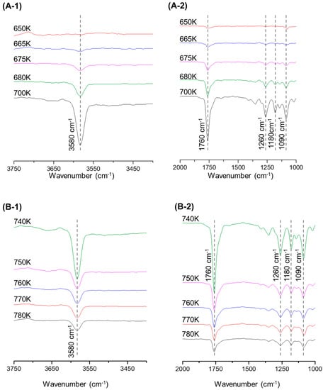 TG-FTIR spectrum drift by temperature during PET pyrolysis: (A-1) 3750–3400 cm−1, in the range of 650–700 K; (A-2) 2000–1000 cm−1, in the range of 650–700 K; (B-1) 3750–3400 cm−1, in the range of 740–780 K; (B-2) 2000–1000 cm−1, in the range of 740–780 K.