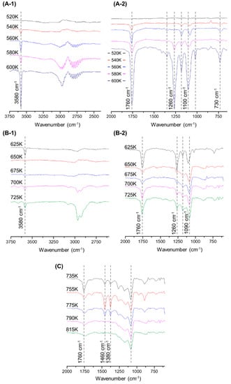 TG-FTIR spectrum drift by temperature during MP pyrolysis: (A-1) 3750–2400 cm−1, in the range of 520–600 K; (A-2) 2000–700 cm−1, in the range of 520–600 K; (B-1) 3750–2400 cm−1, in the range of 625–725 K; (B-2) 2000–700 cm−1, in the range of 625–725 K; (C) 2000–700 cm−1, in the range of 735–815 K.