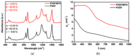 (a) FTIR absorption spectra of fibers made of PVDF/BFO and pure PVDF. (b) Absorption coefficient spectra— of PVDF/BFO and pure PVDF.
