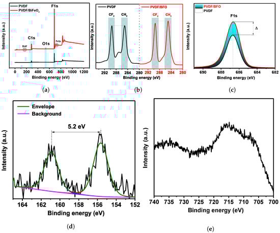 XPS PVDF and PVDF/BFO spectra: (a) wide spectrum, (b) high-resolution C1s spectra, (c) high-resolution F1s spectra, (d) high-resolution Bi4f spectra, (e) high-resolution Fe2p spectra.