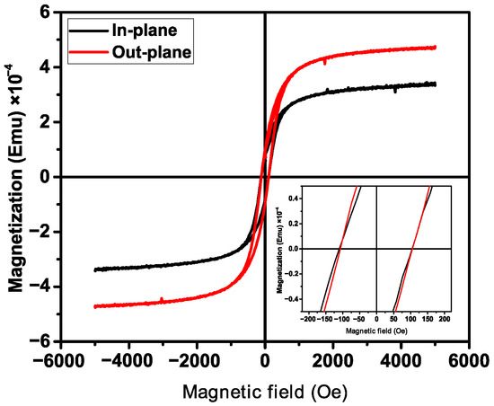 Hysteresis loops (M-H curves) were drawn in order to understand further the coercive force and saturation magnetization of the specimens. This was obtained by measuring the sample’s magnetization (M) as a function of the strength of the applied magnetic field (H) at a constant temperature. The magnetic field was applied parallel and perpendicular to the fiber orientation; the M-H magnetic hysteresis loops for the samples measured at 300 are illustrated in Figure 5.