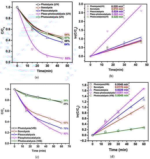Figure 6a,b displays the kinetic curves and the piezo-photocatalytic decomposition plots of MB under simultaneous sonication and UV-visible light. The photodegradation efficiency was 93% during 45 . In a similar experiment with the absence of light (piezocatalysis), 64% decomposed over the same time. In the absence of both the light and a catalyst (sonolysis), it was 54%. The photocatalytic activity of 57% is similar to the photolysis of 58%, which may indicate the absence of photocatalytic properties in the composite since the diameter of the fibers is quite large and the nanoparticles are located inside a thick layer of the PVDF shell that prevents light penetration. The rate constants were also calculated using the pseudo-first-order kinetic equation, the values of which were 0.020; (0.019, 0.024, 0.065, and 0.020) min for photolysis, sonolysis, piezocatalysis, and photocatalysis, respectively. The response rate has risen by (3.18, 3.29, 2.64, and 3.12)× under the simultaneous impact of UV light irradiation and ultrasonic treatment in comparison with photolysis, sonolysis, piezocatalysis, and photocatalysis, respectively. In piezo-photocatalytic experiments using visible light, the trend is similar. The highest activity is shown by piezo-photocatalysis, 83%, with piezocatalysis, 72%, and sonolysis, 62%. There is no significant difference between photocatalysis (23.8%) and photolysis (25%), which also confirms that the composite does not exhibit photocatalytic properties. From the calculated values of the rate constants (0.0048, 0.0176, 0.0229, 0.0281, and 0.0048) min for photolysis, sonolysis, piezocatalysis, piezo-photocatalysis, and photocatalysis, it is evident that the speed of decomposition ramped up (5.9, 1.6, 1.2, and 5.9)× in comparison with photolysis, sonolysis, piezocatalysis, and photocatalysis, respectively.