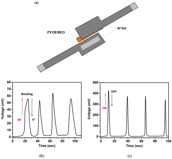 To confirm the generation of the piezoelectric potential under mechanical action or ultrasonic treatment, a piezoelectric nanogenerator (PENG) was fabricated on the composite PVDF/BFO. PENG’s conceptual design and the stress signals that were acquired at a 90° bend and US load are shown in Figure 8a–c. The device (Figure 8a) is a simple multi-layer structure in which the PVDF/BFO film (3 × 1 cm) used as an active piezoelectric component was placed between the upper and lower Al foil electrodes. For compactness, the entire multi-layer structure was then thoroughly laminated with polypropylene (PP) adhesive tape. From both sides of the electrodes, conductive Al taps were attached.
