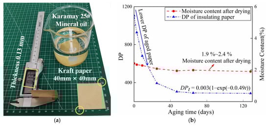 (a) The oil-paper insulation materials. (b) DP and moisture content of the insulating paper.