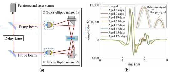 (a) Schematic diagram of transmission THz-TDS system. (b) Terahertz time-domain spectra of air reference and insulating paper with different aging days.
