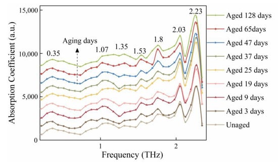 Figure 3 depicts the terahertz absorption spectra of insulating paper samples after various aging intervals. For ease of observation, these spectra were moved by the same distance along the vertical coordinate. Multiple absorption peaks can be seen in the spectra ranging from 0.2 to 2.5 THz for each sample, particularly at 1.80, 2.03, and 2.23 THz.