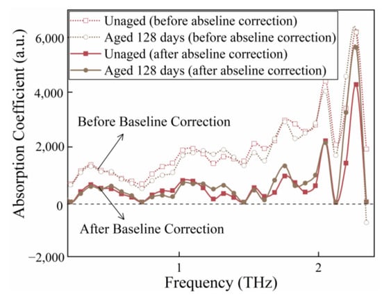 Figure 4 depicts the absorption spectra before and after baseline correction, where the dotted line represents the original signal, and the solid line represents the corrected signal. As an illustration, the measured terahertz time-domain spectra of unaged and aged 128 days insulating paper are depicted in Figure 4 after baseline correction.