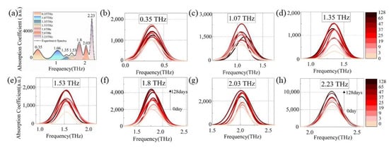 (a) Schematic diagram of the multi-peak fitting of the spectrum after baseline correction and the separated absorption peak curves at (b) 0.35 THz, (c) 1.07 THz, (d) 1.35 THz, (e) 1.53 THz, (f) 1.8 THz, (g) 2.03 THz, and (h) 2.23 THz.