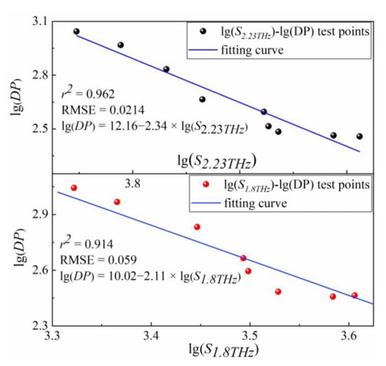 Figure 5b–h demonstrates that although the thermal aging process has a significant impact on the intensities of all seven peaks, only two absorption peaks at 1.8 THz and 2.23 THz exhibit a strong positive correlation with DP value. To further quantify this correlation, the peak areas S1.8THz and S2.23THz were extracted as characteristic parameters and fit with DP values. Figure 6 shows the log-linear fitting curves and regression evaluation indexes. The correlation indices (R2) are 0.914 and 0.962, and the root-mean-square errors of prediction (RMSE) are 0.059 and 0.021, respectively, for fitting curves of S1.8THz and S2.23THz with DP. In the latter part, S1.8THz and S2.23THz were used as the characteristic parameters to quantitatively assess the DP of insulating paper by Equations (7) and (8)