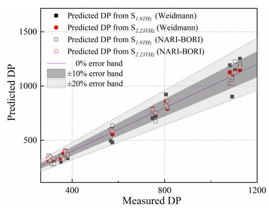To further examine the universality of characteristic parameters, two batches of 0.13 mm-thick kraft insulating paper purchased from Weidmann (Weidmann Power Insulating Technology Co., Ltd., Jiaxing, China) and NARI-BORI (Chongqing NARI-BORI Transformer Co., Ltd., Chongqing, China) were selected as the sample materials, then thermal aging experiments were reconducted at 130 °C lasting 0, 3, 9, 17, 25, 37, 47, 65, and 128 days. A total of 36 samples were collected as the validation sample set with two samples at each aging day for each type of insulating paper. After baseline correcting and split-peak fitting, the parameters S1.8THz and S2.23THz were extracted and substituted into Equations (7) and (8). As shown in the Figure 7, the prediction error bands were 1.4–19.1% and 1.3–9.9% for S1.8THz and S2.23THz, respectively, covering two types of insulating paper (purchased from Weidmann and NARI-BORI company), with the prediction error for the S2.23THz being less.