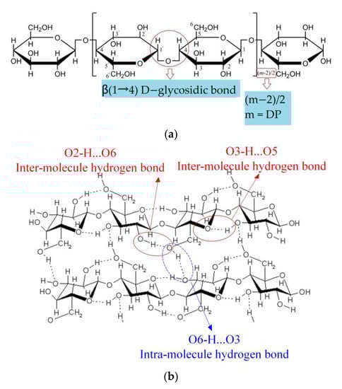 (a) Repetitive unit of cellulose. (b) Inter- and intra-molecule hydrogen bond structure of cellulose.
