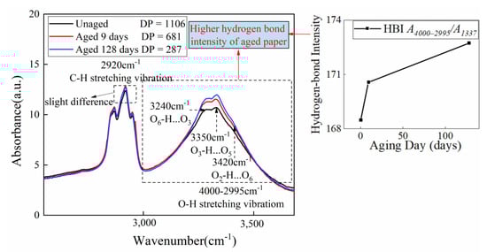 Figure 9 shows the FTIR spectra of the insulating paper before and after the thermal aging experiment over a wavenumber range of 4000–2995 cm−1, which is the superposition of multiple -OH stretching vibration bands. In the 4000–2995 cm−1 band, 3600–3200 cm−1 is assigned to the O-H stretching vibration, while 3455–3410, 3375–3340, and 3310–3230 cm−i are attributed to the intramolecular O2–H…O6, O3–H…O5, and intermolecular O6–H…O3 H-bonds (seen in Figure 8b), respectively. Therefore, the ratio of the absorbance at 4000–2995 cm−1 to those at 1337 cm−1 due to C-OH in-plane stretching can be used to quantify hydrogen-bond intensity(HBI) [] as depicted in Figure 9, indicating that the H-bond structure’s strength of aged insulating paper increased. The pores between cellulose chains become larger due to the thermal aging process, making it easier for water molecules to bind to cellulose and increasing the amount of water–cellulose hydrogen bonds, which results in a rise in HBI.