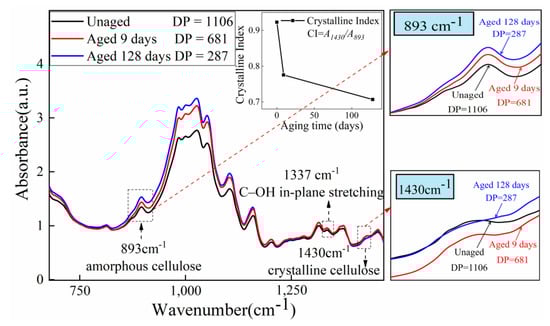 Further analyzing the crystal structure of cellulose, the bands at 893 cm−1 (attributed to vibration of β-glyosidic bond and C1-H) and 1430 cm−1 (attributed to stretching vibration of CH2) are sensitive to the amorphous region and crystalline region, respectively. For cellulose to experience the thermal aging process, the peaks at 1430 cm−1 become weaker while the peaks at 893 cm−1 become stronger, suggesting that crystalline cellulose partially degrades into amorphous cellulose. O’Connor et al. proposed the absorbance ratio of two bands, O’KI = A1430 cm−1/A893 cm−1, as the crystallinity index (CI) []. In order to eliminate the influence of baseline drift, the peak area rather than intensity is actually used in the CI formula. The calculated CI from FTIR spectra of the insulating paper decreases with increasing aging, as shown in Figure 10.