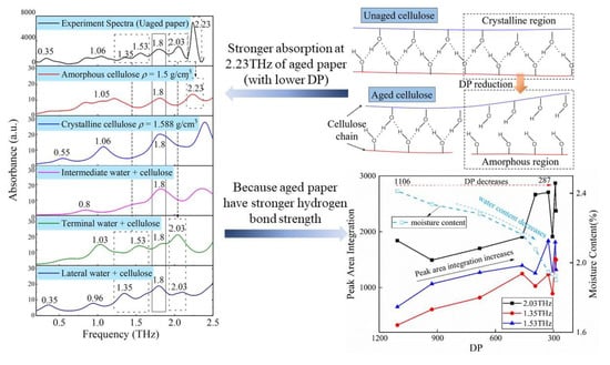 Over the range of 0.2 and 2.5 THz, the vibration mode of insulating paper is mainly the interaction between water and cellulose molecules. The absorption of insulating paper in the 0.8–1.2 THz band is due to the synergistic vibration of water and cellulose molecules. Further study of the experimental spectra revealed a limited association between the absorption of 0.8–1.2 THz and the DP value as shown in Figure 5b,c; hence, this paper does not discuss it in great detail. The absorption peaks at 1.35, 1.53, and 2.03 THz are one-on-one associated with the vibration of water–cellulose molecules having lateral, terminal, and intermediate water, respectively. FTIR analysis showed an increase in the crystalline region and H-bond strength of cellulose after thermal aging (seen in Figure 9), while THz absorption spectra showed an increase in the absorption peaks intensity associated with bound water (see lower right corner of Figure 13), i.e., 1.35, 1.53, and 2.03 THz. It indicates that the increase in the amorphous region leads to an increase in the H-bond strength of the bound water, which in turn enhances the overall H-bond strength of the insulating paper.