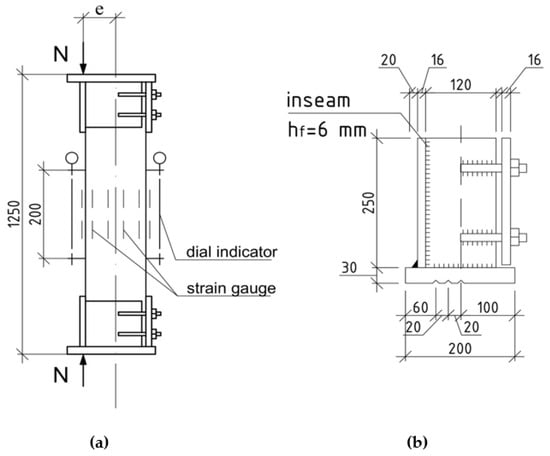 Loading of prototypes was carried out using a DG-200 jack, developing a force of N = 2000 kN. The load on the columns was transmitted by two multidirectional forces through the blades of triangular isosceles knives. The latter were installed on a jack and under the top plate of the press. The force from the knives to the column was transmitted through steel heads with three slots to fix the eccentricities. Considering the thickness of the end plates of the heads, the estimated length of the columns was 1250 mm.