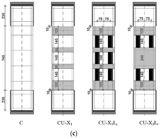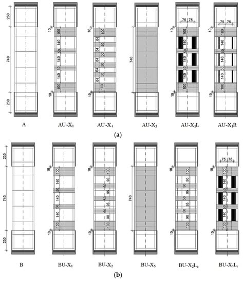 Using these materials, 13 different reinforcement variants were developed: 5 variants for reinforcing samples of series A, 5 for series B, and 3 for series C. The reinforcement variants were divided into 3 types—external transverse, longitudinal, and combined reinforcement. The variants of reinforcements are shown in Figure 4. Each variant is indicated by an alphabetic and numeric code. It is presented as follows.