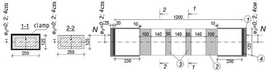 The first three capital letters of the alphabet—A; B; C—designate reference samples without reinforcement that were prepared for a constructive version of reinforcement with stirrups, which will be tested, respectively, with an axial eccentricity of the load application = 0; = 2.0 cm (0.16 h); = 4.0 cm (0.32 h).