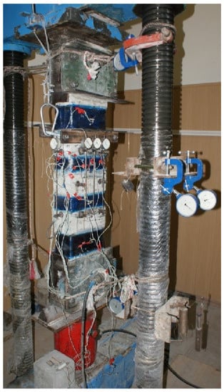 The loading of prototypes during the test was carried out with a step-increasing load with an intensity of 1/20 of the theoretical breaking load at levels up to and above , and outside these limits. Holding under load at each stage of loading was 10–15 min, during which twice at the beginning and end of the stage, instrument readings were taken, and the width of cracks after their appearance was measured. Reference samples (without reinforcement elements) were tested first. The reinforced specimens were tested at the same load steps as the reference ones to be able to directly compare the test results and determine the effect of composite reinforcement on the change in the strength of the columns.