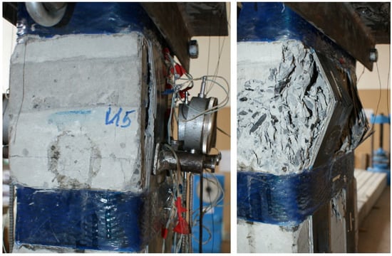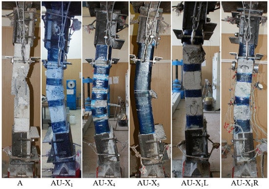 Column (5), in which, simultaneously with the transverse clamps, two strips of carbon laminate were glued on opposite sides, also did not increase its strength [9]. This is quite understandable, since approximately at a load level of about 80%, the laminates were destroyed due to local buckling of the strips and their fracture (Figure 11).