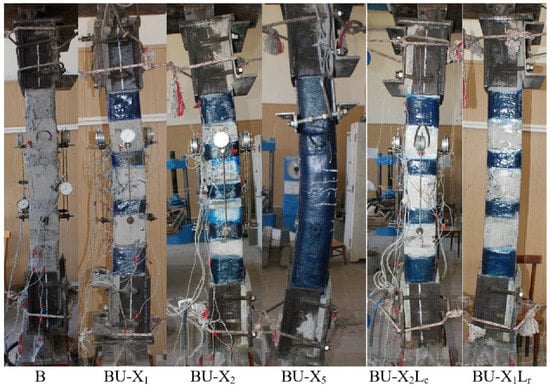 The choice of the optimal scheme for strengthening the structure during repair and restoration is a scientific problem, especially with an eccentrically applied load [41]. Twenty-two reinforced concrete columns were reinforced using various patterns, including surface mounted CFRP strips in tension and compression zones, and tested eccentrically ( = 0.38). The test results showed that the hybrid repair method significantly contributed to the restoration of the original load capacity with an average load increase of 16%. The type of destruction of the columns consisted mainly of the delamination and destruction of the concrete pavement in the compression zone, accompanied by the local buckling of the reinforcement. The hybrid technique has improved the deformability, toughness, and axial stiffness of the reinforced columns.
