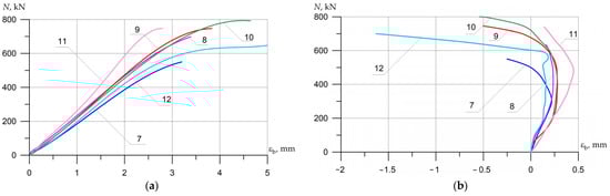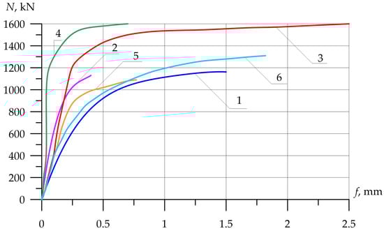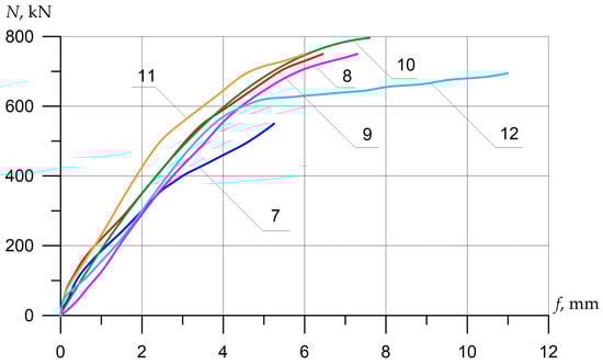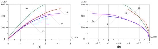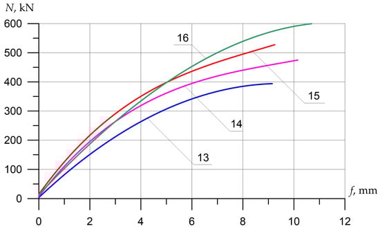 Columns (15) and (16), which were reinforced with external longitudinal composite reinforcement in combination with transverse stirrups, increased their strength compared to the reference (13) by 25 and 44%. Figure 12, Figure 13 and Figure 14 show the experimental dependences of the bearing capacity on the deflection of the columns. The numbers on the graphs correspond to the column numbers in Table 4.