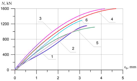 Comparison of the average experimental values of the relative deformations of concrete in compression (a) εb and tension (b) on opposite faces of the columns ( = 10) depending on the load and variants for composite reinforcement with axial eccentricity = 2.0 cm (0.16 h). The numbers on the graphs correspond to the column numbers in Table 4.