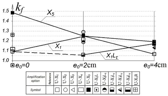 With eccentricity = 0, the greatest effect of amplification was shown by the X5 amplification variant in the form of a solid clip. The gain factor for this variant was 1.41 or 41%.