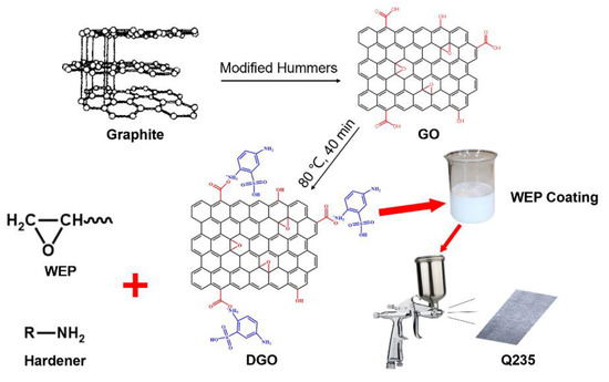Figure 1. The synthesis scheme of DGO and waterborne epoxy resin coatings.