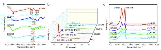 Figure 2. FT-IR spectra (a), XRD spectra (b) and Raman spectra (c) of GO, DGO05, DGO10 and DGO15.