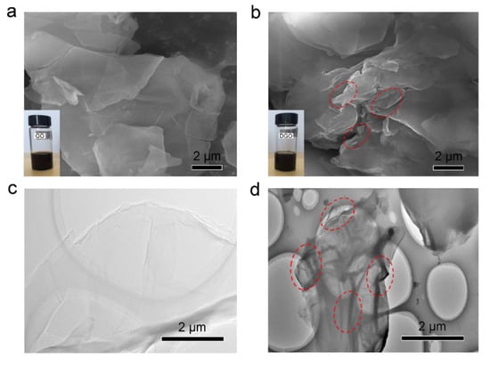 In summary, combined with FT-IR, XRD, and Raman analysis, it is concluded that optimal modified GO can be achieved when the mass ratio of 2,5-diaminobenzenesulfonic acid with GO is 5:1, which be used as a functional filler in the subsequent preparation of waterborne epoxy resin coatings. The water dispersion of GO and DGO10 was tested in water for 100 h. Additionally, the SEM and TEM images of GO and DGO10 are shown in Figure 3. The smooth surface of GO can be observed clearly in Figure 3a,c, which indicates that GO was successfully synthesized using a modified Hummers method. The surface of DGO10 became rougher than GO but still maintained a complete sheet structure (indicated with red circles in Figure 3), as shown in Figure 3b,d. Further, the increased interlayer spacing of segregated GO nanosheets, which is confirmed by XRD analysis in Figure 2b, can be observed by comparing the SEM and TEM images of GO and DGO1.